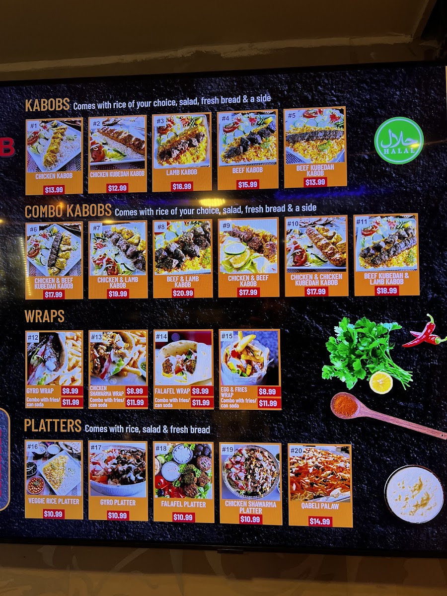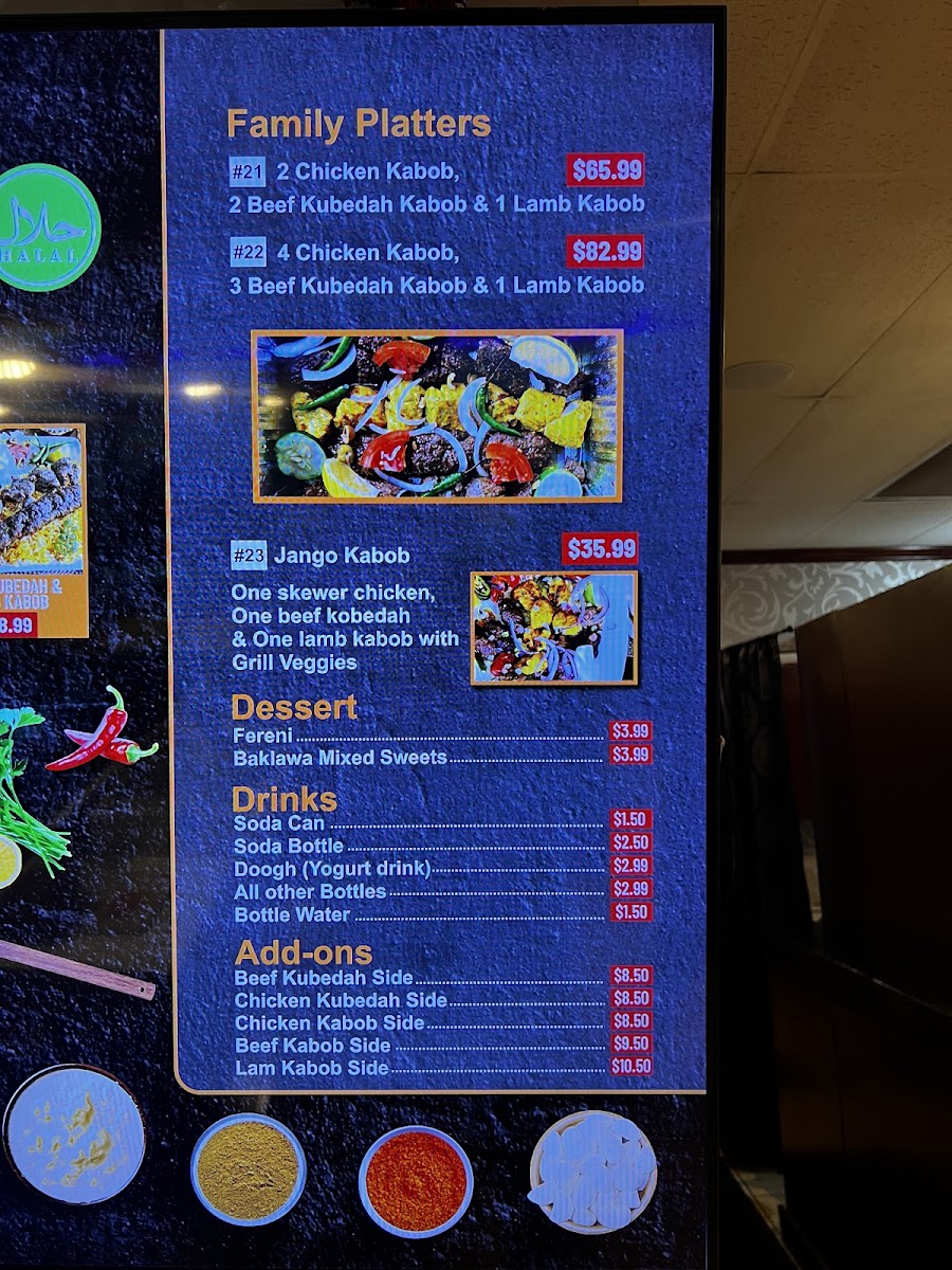 Additional add-ons provide the option to enjoy side portions of various kabobs, including Beef Kubedah, Chicken Kubedah, Chicken Kabob, Beef Kabob, and Lamb Kabob.